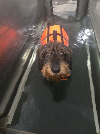 Frieda, Dackel, 5 Jahre, hatte einen Bandscheibenvorfall. Nach der OP war sie zunächst auf beiden Hinterbeinen gelähmt. Hier ist sie vier Wochen später zu sehen. Frieda läuft und springt fast wie zuvor auf allen vier Pfoten.